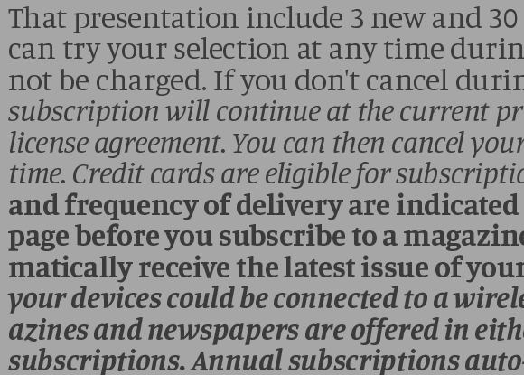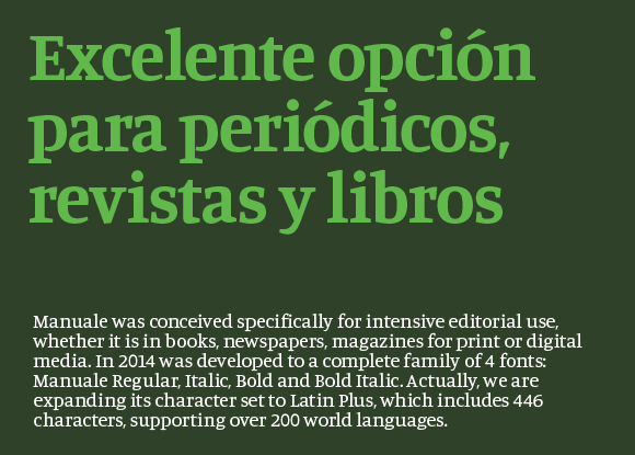 Como parte de la colección Press Series, Eduardo Tunni y Pablo Cosgaya están desarrollando Manuale (Regular, Italic, Medium, Medium Italic, Semibold, Semibold Italic, Bold, Bold Italic), una nueva familia para ediciones periódicas impresas y en línea, basada en el diseño de la premiada Loreto. Integran la serie la familia Faustina (un diseño de Alfonso García, con 4 variables) y la súper familia Saira (un diseño de Héctor Gatti, con 36 variables). La producción cuenta con el apoyo del equipo de Omnibus-Type.
